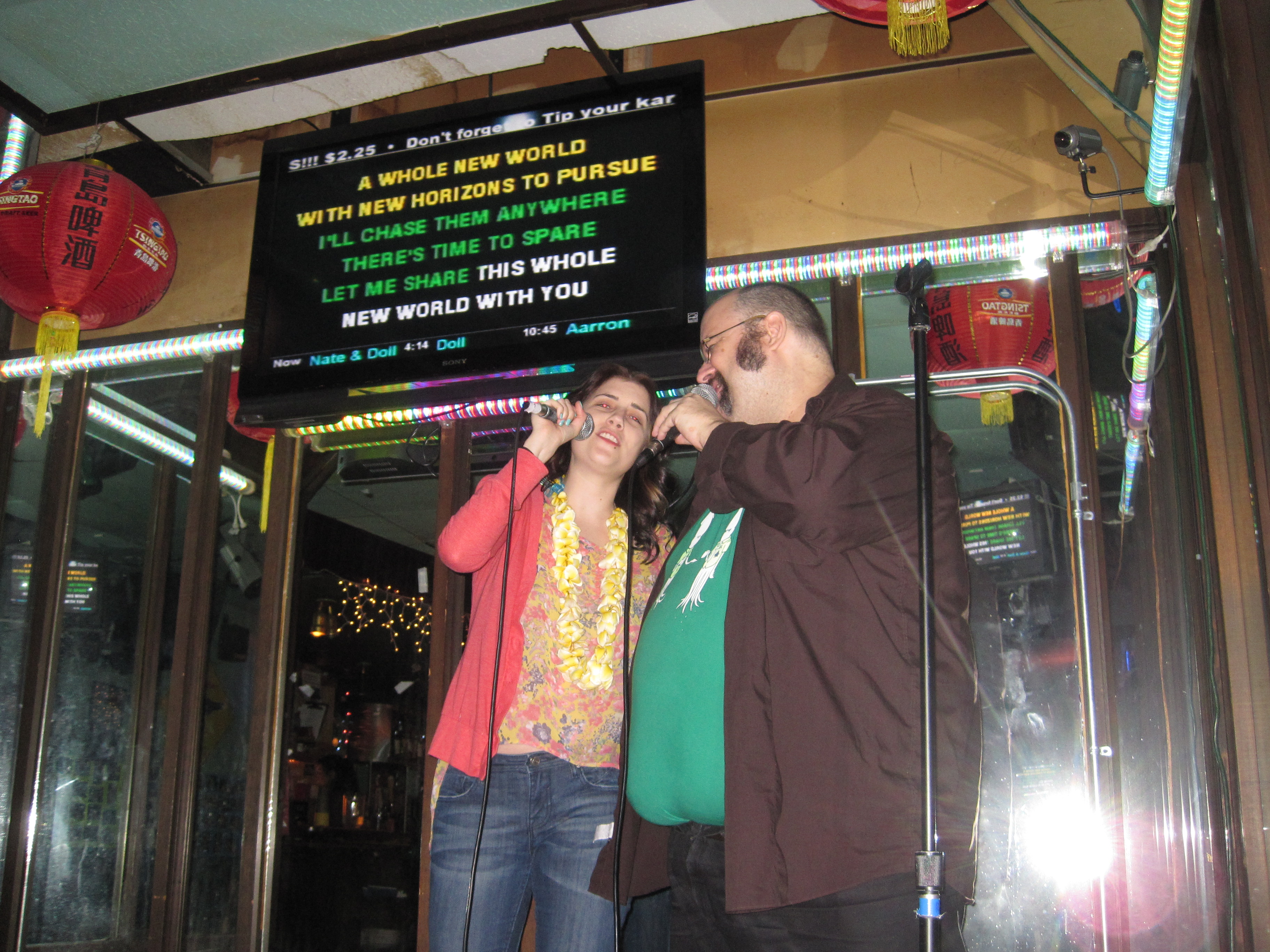 That’s her in the picture. The one in the lei, in case you were confused. We’re both karaoke junkies. “A Whole New World” was not my choice for final duet, but I don’t think I’m exaggerating when I say it was probably the best rendition of it ever sung in the history of mankind. (What do you know! You weren’t there!)