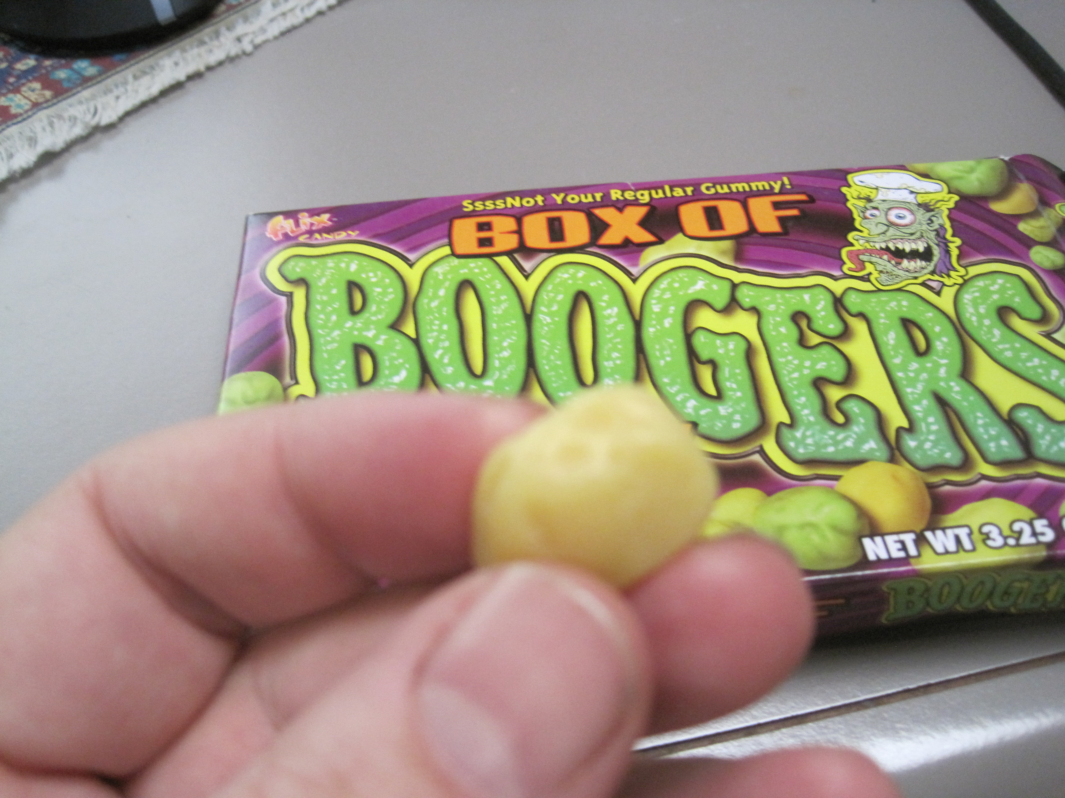 Box of Boogers is made by Flix Candy just north of Chicago (though the candy itself is made in China). It’s part of their seasonal Halloween line, because late October is when boogers ripen and are picked and packed…