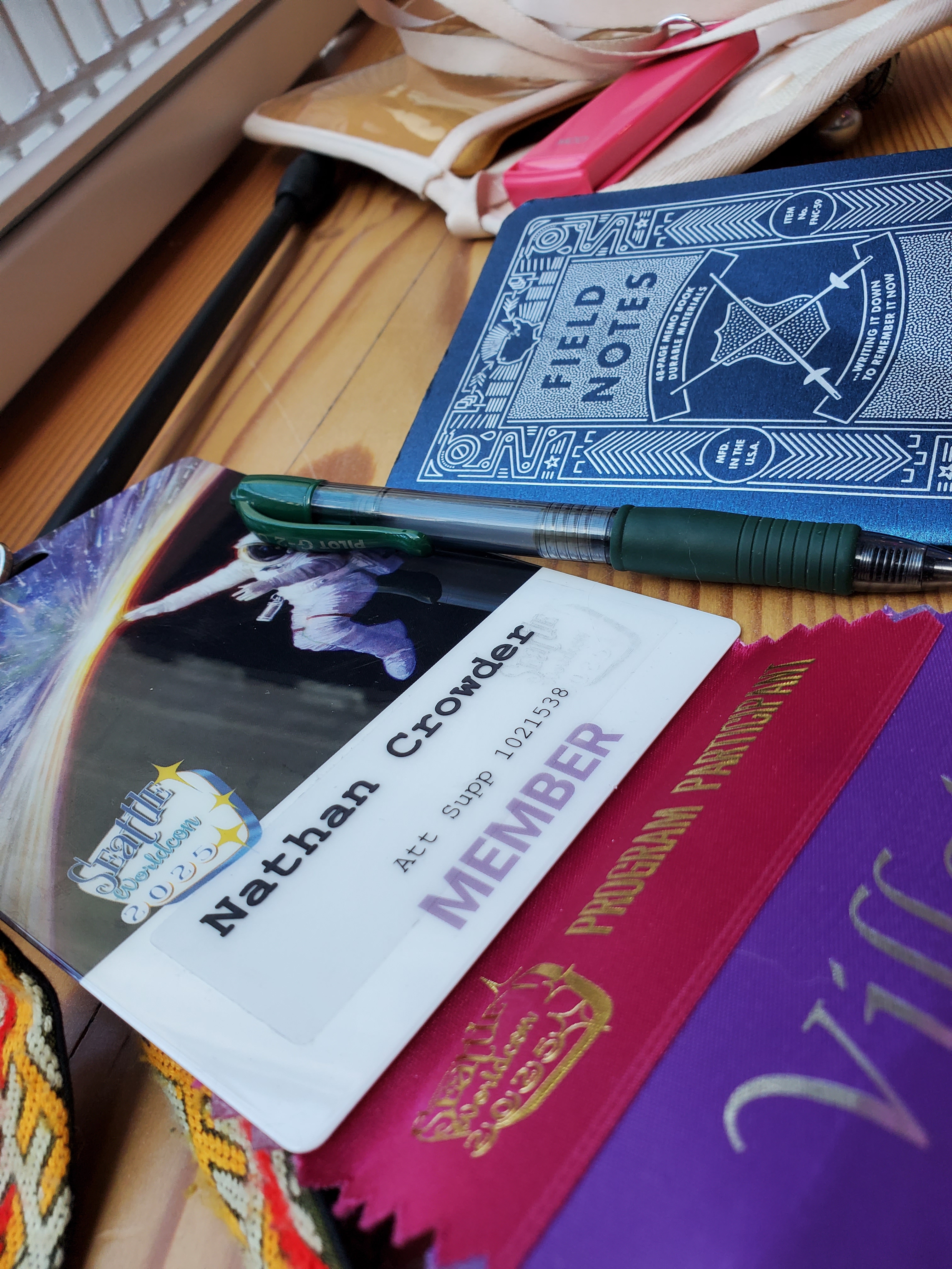 And then there were pleasant surprises like: the light rail into the city was actually quite lovely. There were inexpensive food options, including the absolute angel running the sausage cart a block from the con on the way to the light rail station (that hot link Seattle Dog saved my life that first day at the end of an exhausting twelve hours). I got to see so many lovely peers who I haven’t seen often since The Plague descended upon the planet. I also got to meet several new (to me) incredible people. I got to hang out with friends who I adore, including my lovely agent Gabrielle who worked her ass off introducing me to some people I very much hope to work with in the future.